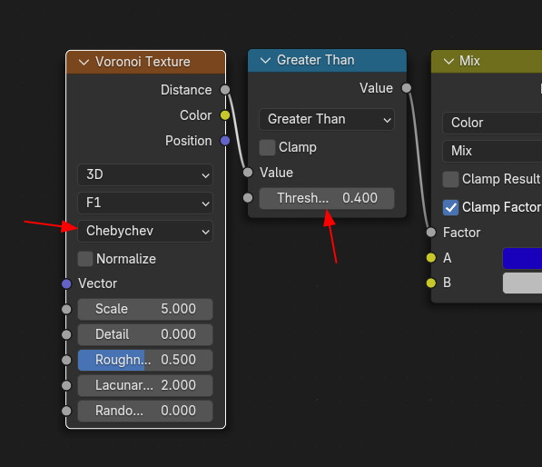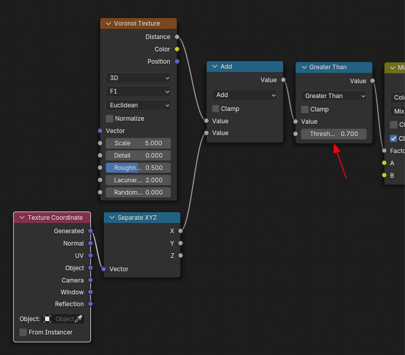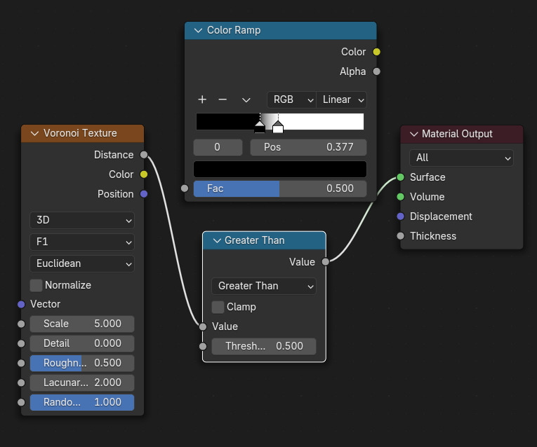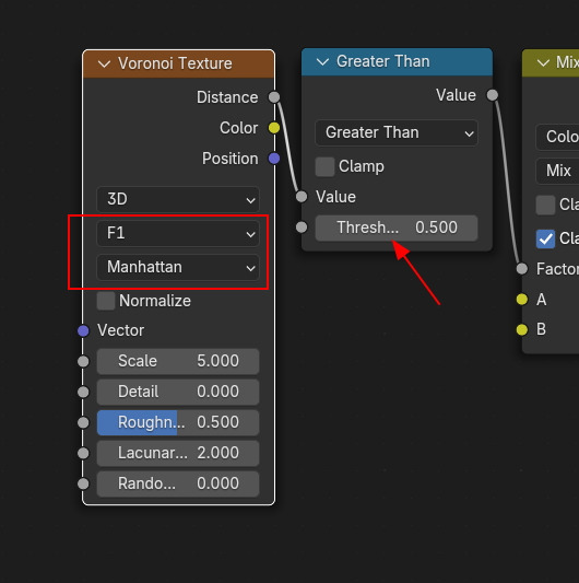 Color Ramp 또는, math 노드, Greater Than으로 사용하면, Threshold 를 0.5로 합니다.