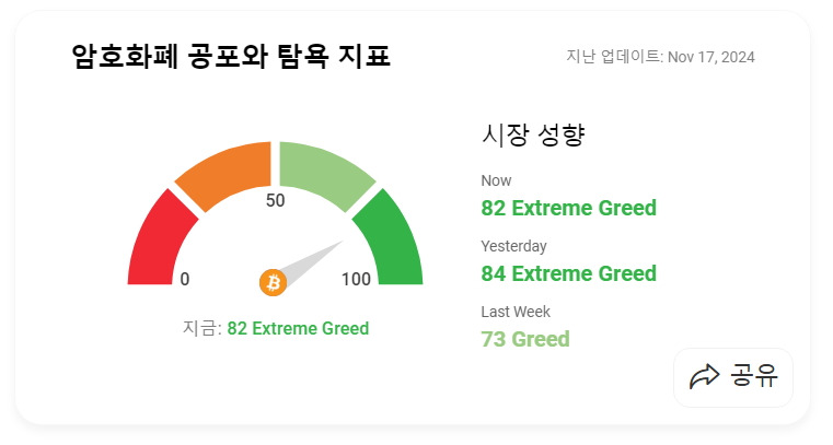 공포 탐욕 지수는 조금 하락한 82, 77 입니다.