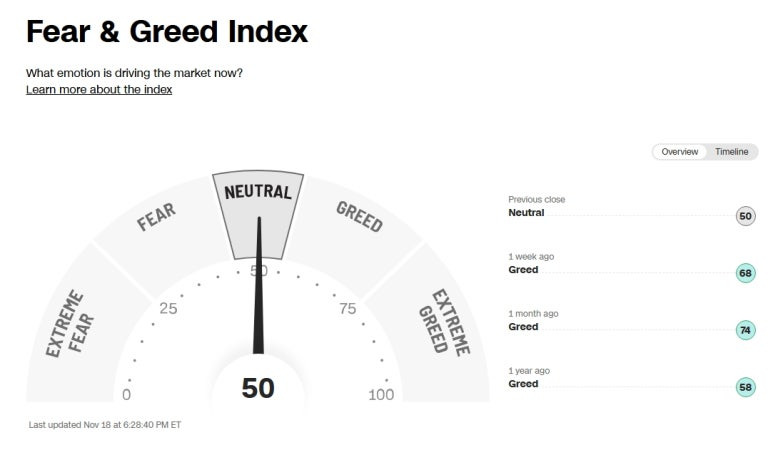 미국 증시 공포 탐욕 지수 (Greed and Fear Index) : 50