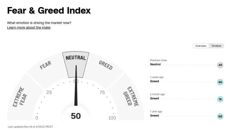 미국 증시 공포 탐욕 지수 (Greed and Fear Index): 50