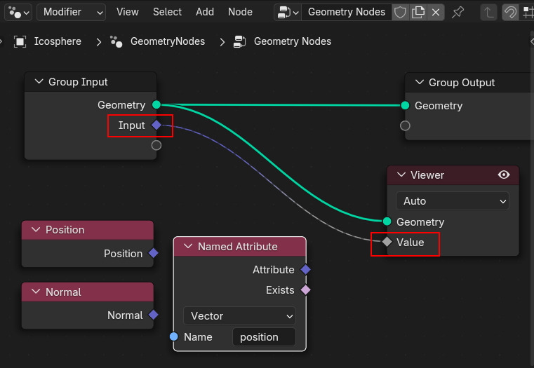 Group Input의 Geometry와 Input(값 position)에 Viewer를 연결해서 봅니다.