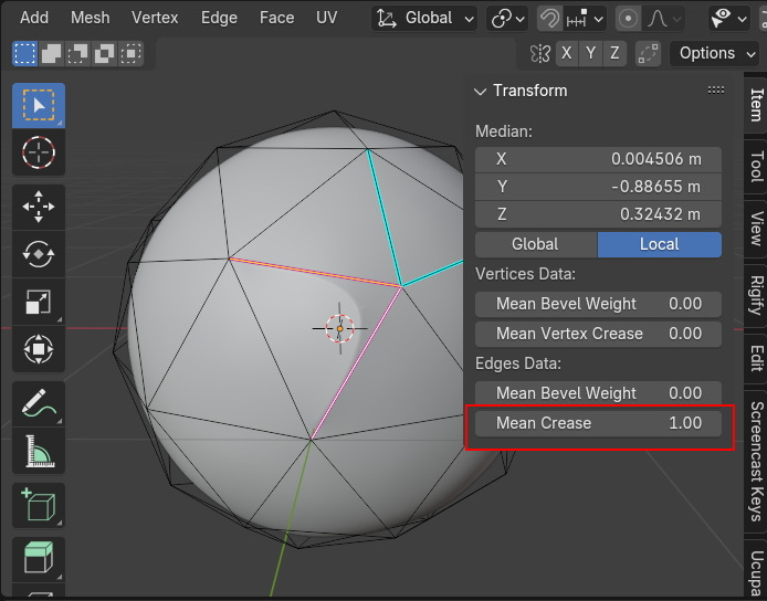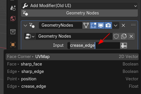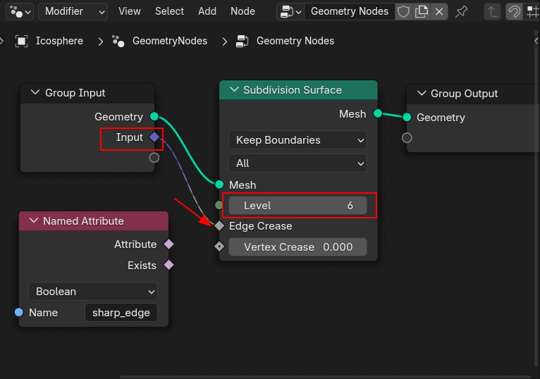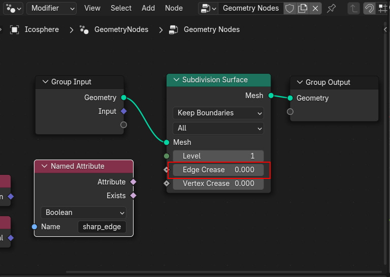 Subdivision Surface Node를 생성해서 연결해서, Crease 속성을 불러서 Edge Crease에 연결해 봅니다.