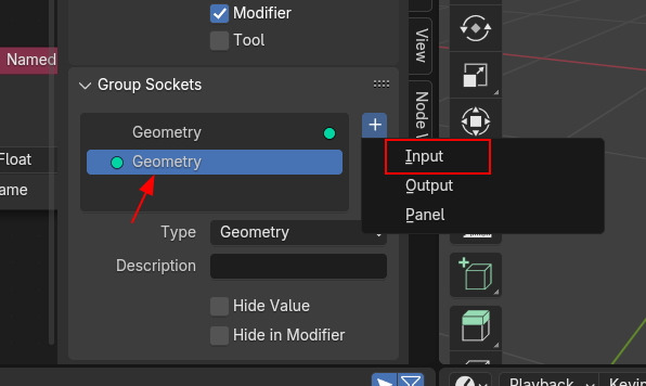 Group Input 노드를 선택하고, N키를 클릭한 후, Group 탭에서 Group Sockets 에서 하단 Geometry 를 선택합니다.