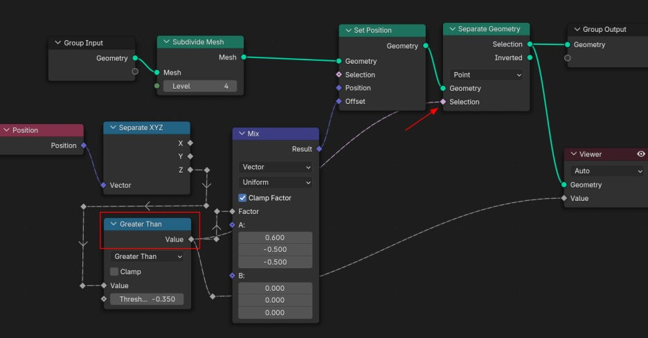 Greater Than 에서 Separate Geometry의 Selection으로 연결합니다.