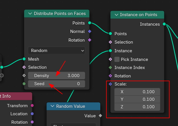 Points 노드를 생성하고, 앞에 랜덤 값을 받으면,