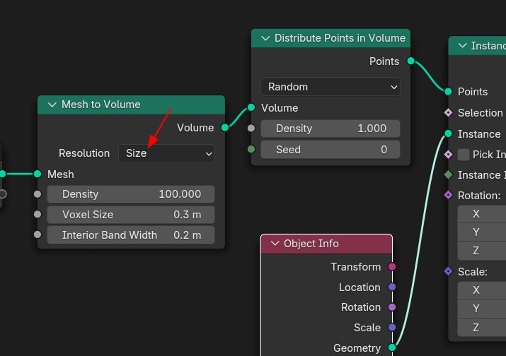 Mesh to Volume로 메쉬를 Volume으로 전환하고, Distribute Points in Volume로 Volume에 분산 배치합니다.