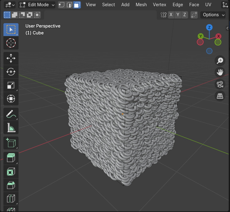 에디트 모드로 보면, Mesh의 표면에 이렇게 분산 배치됩니다.