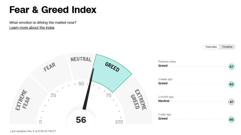 미국 증시 공포 탐욕 지수 (Greed and Fear Index): 56