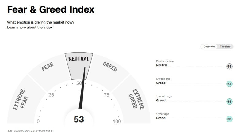 미국 증시 공포 탐욕 지수 (Greed and Fear Index): 53