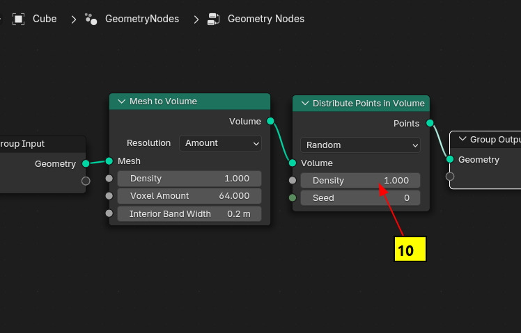 이 Volume을 Point 분배 로 받고, 밀도를 10으로 올려 줍니다.