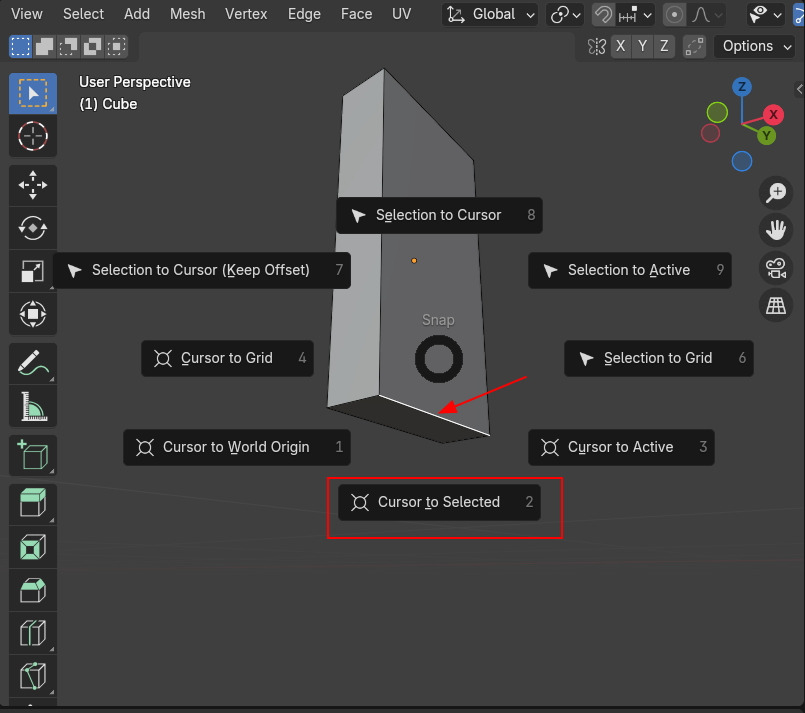 회전 하는 방향에 위치하는 엣지를 선택하고, 3d 커서를 선택한 곳으로 이동 시킵니다.