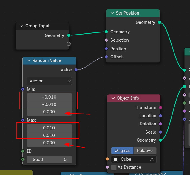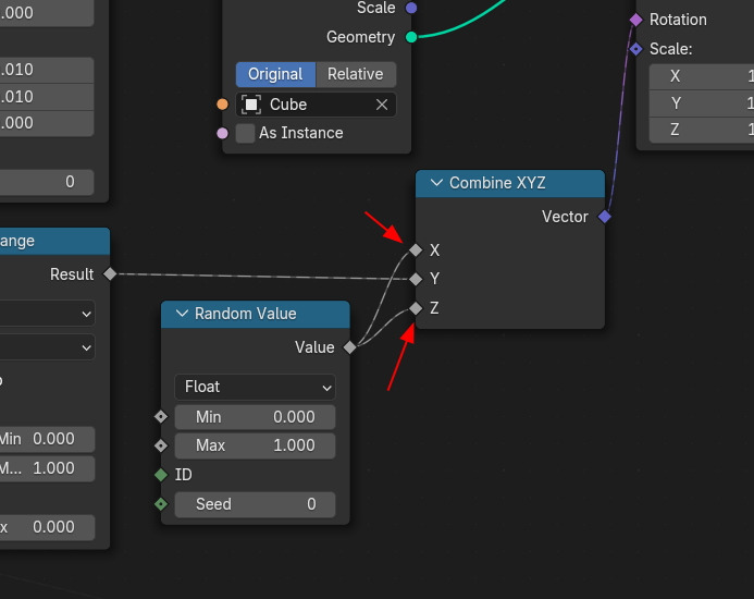 위치값에 랜덤을 적용한 것과 같이, 회전에도 랜덤값을 부여해 봅니다. Combine XYZ 에 X,Z에 랜덤하게 넣어봅니다.