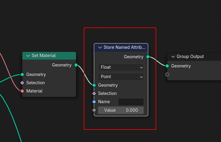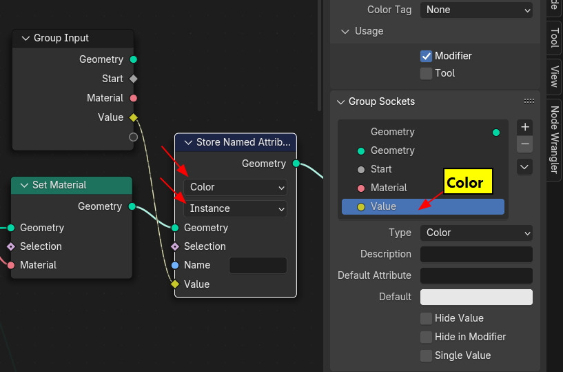 Store Named Attribute에 Color값을 받고, Geometry가 아니고, Instance이고, Group Input에 연결하며, 이름은 Color로 합니다.