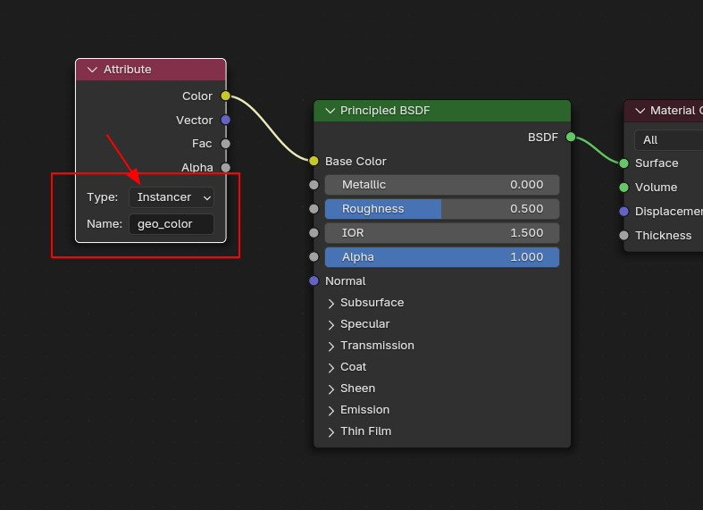 그리고 Shader Editor로 이동합니다. Attribute 노드를 생성해서, Type을 Instance, Name은 geo_color를 불러 오고, Base Color로 연결합니다.