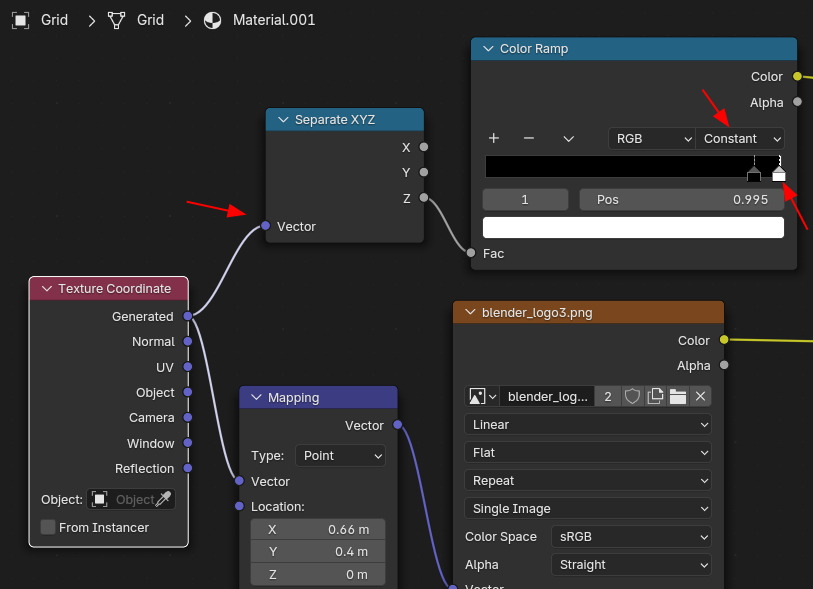 Texture Coordinate를 UV에서 Generated로 연결하고, 적당히 위치와 크기를 조절하면,