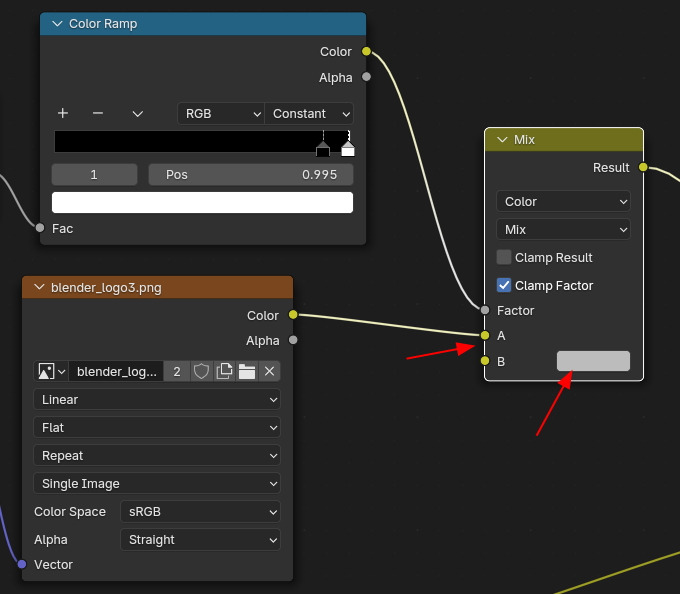 Z축에 Color Ramp를 통과한 값이 Factor로 들어가고, Image를 A, B는 White Color를 적용합니다.