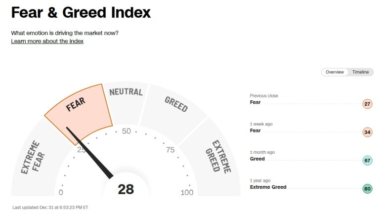 미국 증시 공포 탐욕 지수 (Greed and Fear Index): 28