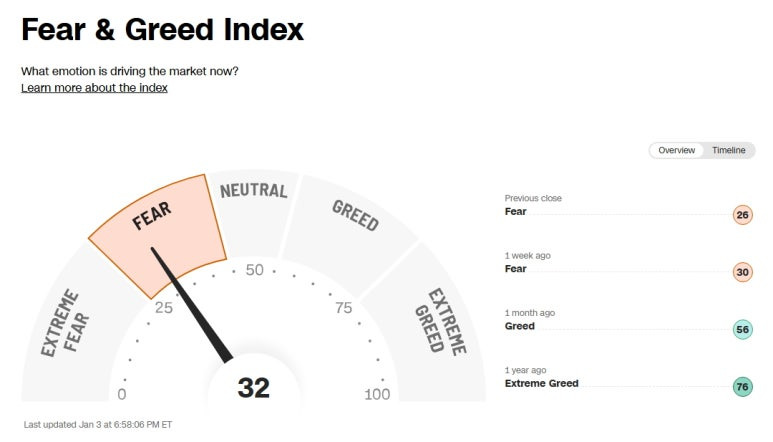 미국 증시 공포 탐욕 지수 (Greed and Fear Index): 32
