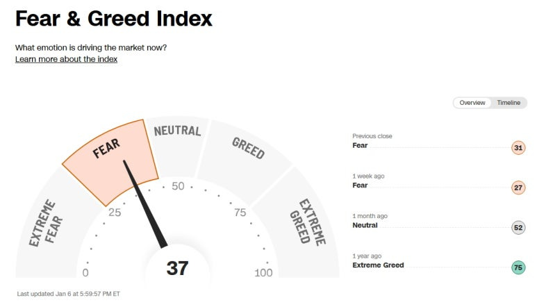 미국 증시 공포 탐욕 지수 (Greed and Fear Index): 37