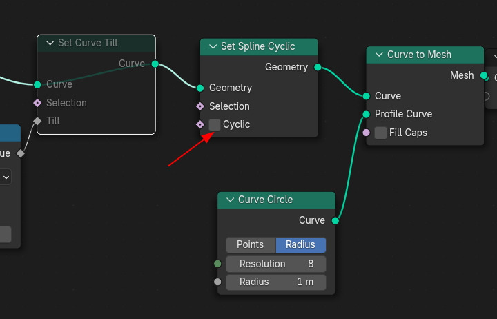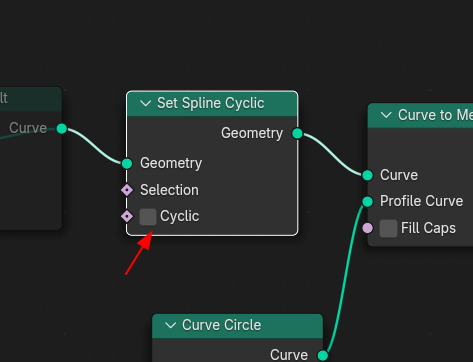 다음은 Set Spline Cyclic 노드 입니다. Cyclic 즉, 'Open Curve', 'Close Curve' 로 전환합니다.