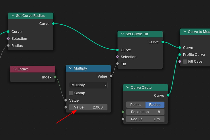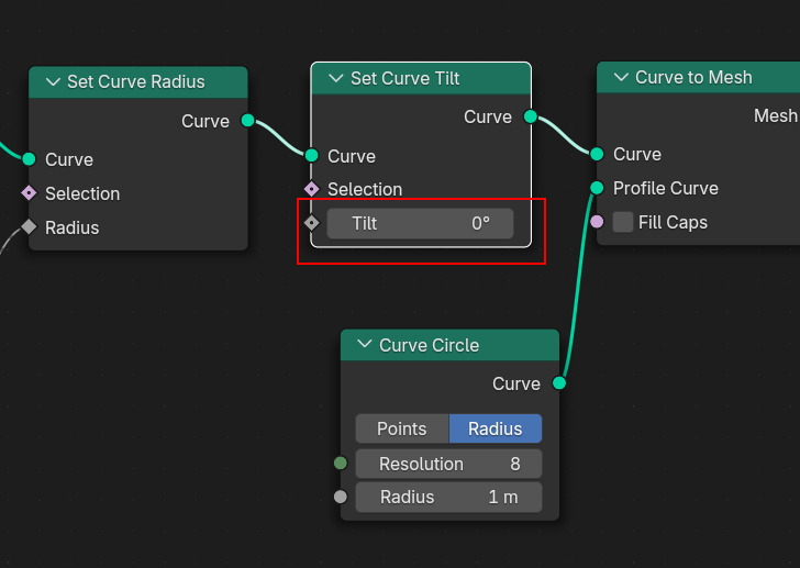 Set Curve Tilt 노드는 Point를 감싸는 Mesh를 회전 시킵니다.