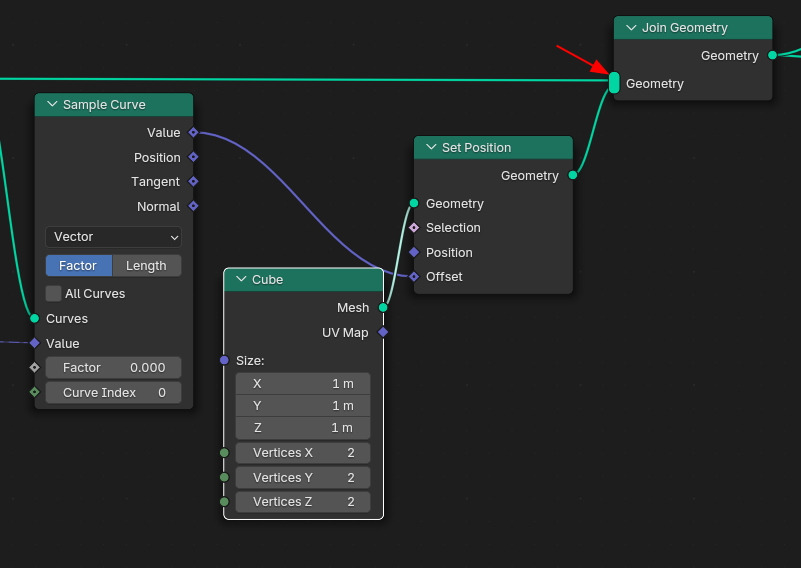 이 Path를 따라갈 Cube를 생성하고, 그 Cube의 움직임을 조절하는 Set Position노드를 생성해서 연결합니다. Mesh 는 Geometry로 연결합니다.
