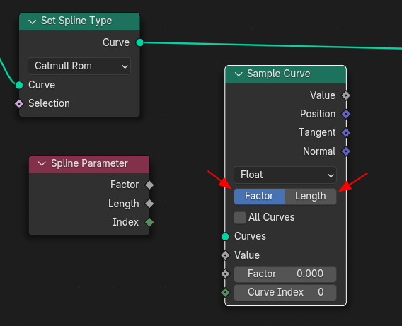Sample Curve노드 안의 옵션에 Factor, Lenght, 그리고 Float 를 주로 콘트롤 합니다.