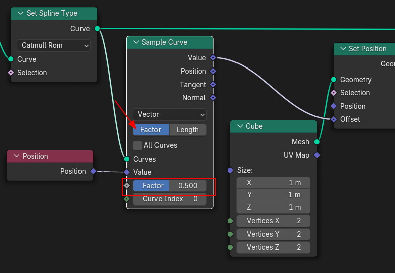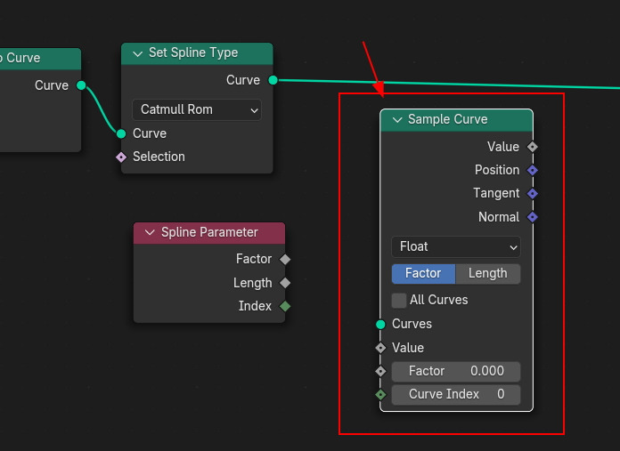 Spline Type에서 나온 Curve가 Sample Curve의 Curves으로 들어가고, Position의 아웃풋 소켓을 Value로 받습니다. Float(실수)는 Vector로 변경합니다.