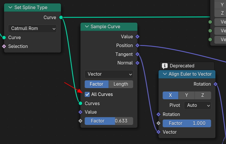 Align Euler to Vector 노드를 사용해서 Vector로 Tanget를 받고,