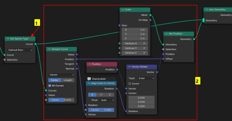 Cube 노드가 0번 Curve 로 위치해 있고,