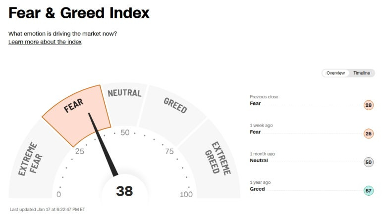 미국 증시 공포 탐욕 지수 (Greed and Fear Index): 38