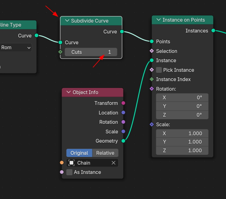Point의 위치에 배치를 Subdivide Curve를 하면, Cuts 1은 1번 나눕니다.