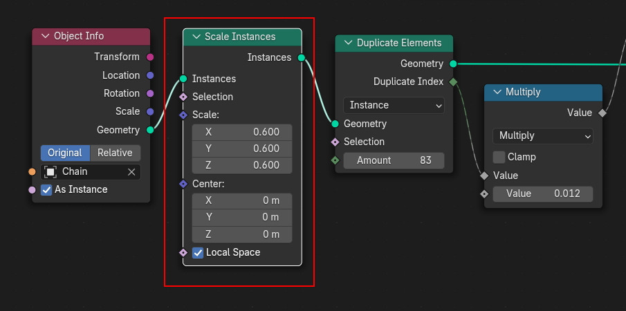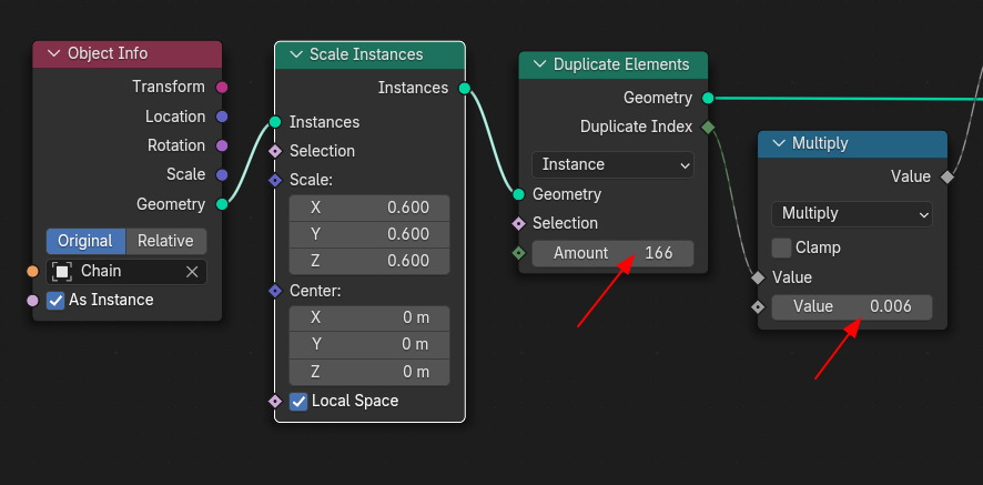 Duplicate Elements의 Amount에서 갯수를 늘이고, Math, Multiply 의 Value 로 간격을 조절합니다.