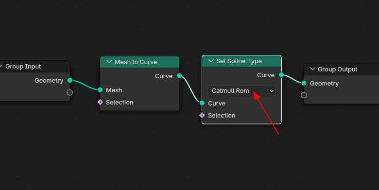 Geometry Nodes 를 생성하고, 항상 만들던, Mesh to Curve노드와 Set Spline Type노드를 생성합니다.