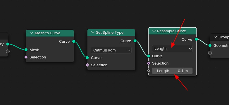 Resample Curve노드 의 Type을 Length 를 선택하면, 값 입력이 Length 로 변경이 됩니다.