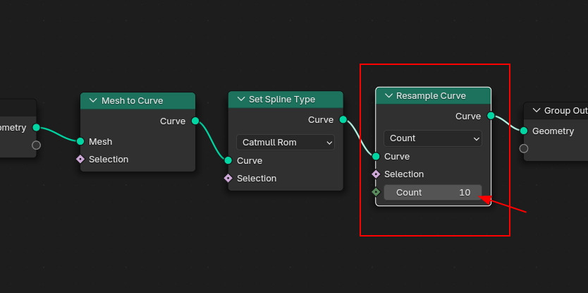 이 Spline Curve 에서 Resample Curve 노드에서 Count 를 높여 봅니다.