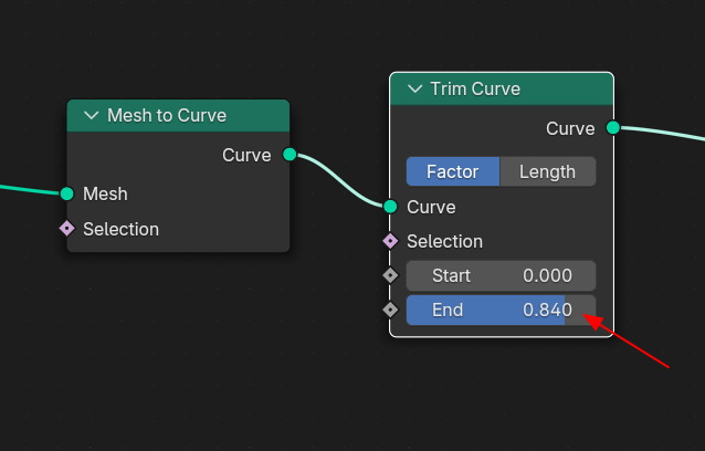 Trim Curve 노드를 연결합니다. ( 다듬을 부분이 Start와 End에서 할 수 있습니다. )