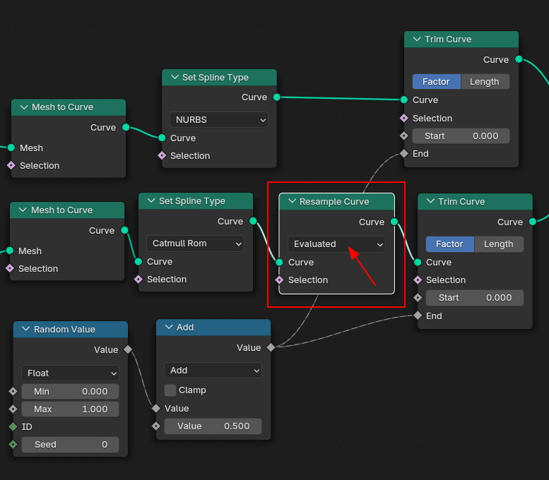 Set Spline Type 노드 다음에 Resample Curve를 연결하고, Evaluated를 선택하면...
