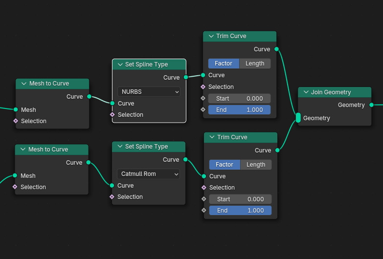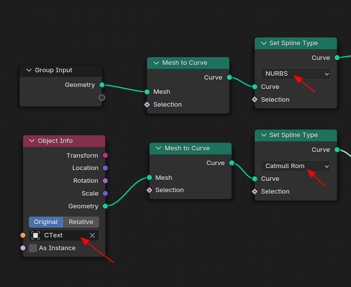 Ctext 는 Object Info로 불러 들여서 , Mesh to Curve 노드로, Spline Type은 Catmull Rom으로 하고,