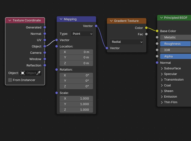 Radial을 확인하려면, Shader Editor에서, Gradient Texture를 아래와 같이 연결하고,
