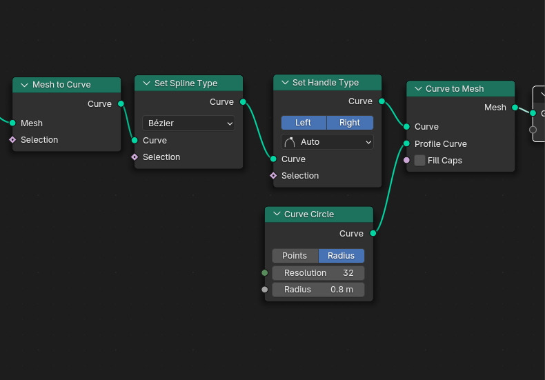 그리고 Mesh to Curve로 Spline으로 만들고, Set을 Bezier를 하고, Bezier의 Handle 을 세팅하고, 타입을 Auto로 Spline을 부드럽한 후, 다시 Curve를 Mesh로 전환하고, 그때, Profile 을 Curve Circle (R:0.8)을 받고,