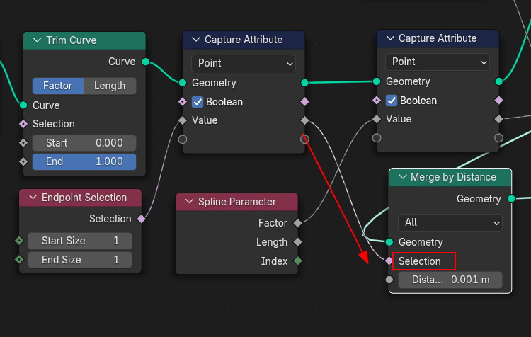 Curve에서 Capture Attribute 즉, 시작과 끝 지점을 선택되어진 값을 Merge by Distance의 Selection에 넣어줍니다. 그럼, 1 지역만 Merge 를 체크하고 나머지 부분은 체크 하지 않습니다. (작업 효율성 UP)