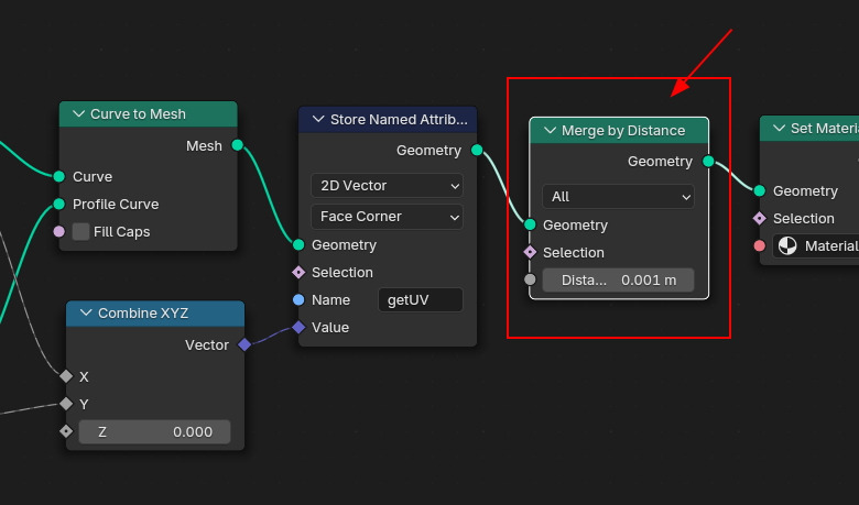 이것은, Store Name Attribute노드로 UV를 건내주고, Set Material노드 앞에 Merge by Distance로 붙여 줍니다.