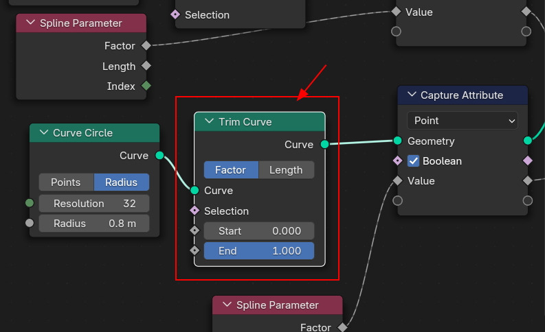 Capture Attribe를 하나 더 만들어서, Trime Curve 노드 다음에 배치하고,
