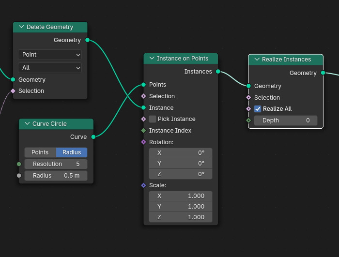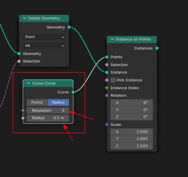 이것을 Instance on Points 생성해서 Instance로 연결하고, Curve Circle을 Points로 연결합니다.