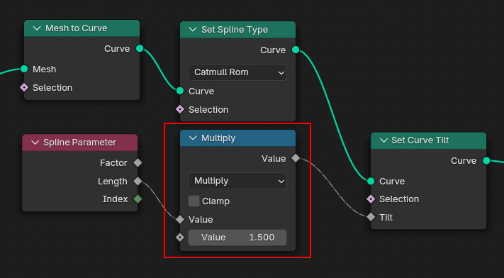 Curve Tilt의 Tilt에 Spline Parameter에 Lenght를 연결합니다. Tilt에 길이에 따라서 메뉴를 실행합니다.
