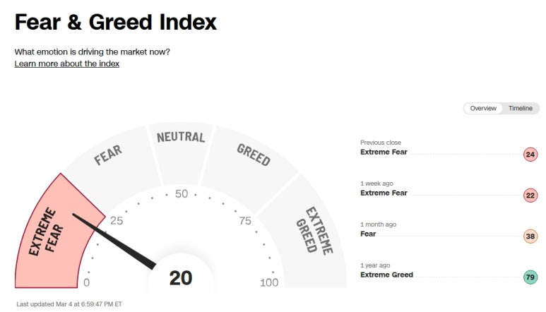 미국 증시 공포 탐욕 지수 (Greed and Fear Index): 20
