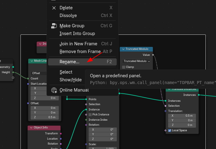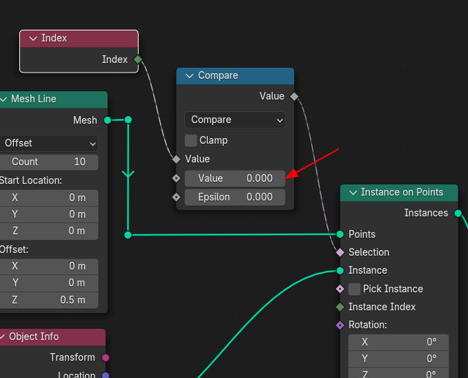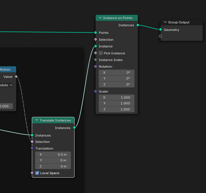 X값을 0.5 이동 시킵니다. (홀수는 2로 나눠서 나머지가 1 인 수 입니다. Modulo노드가 나머지를 구하는 노드. 그래서 1은 True이므로, 홀수가 0.5 만큼 이동)