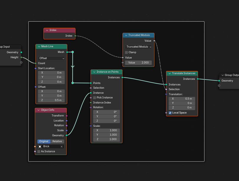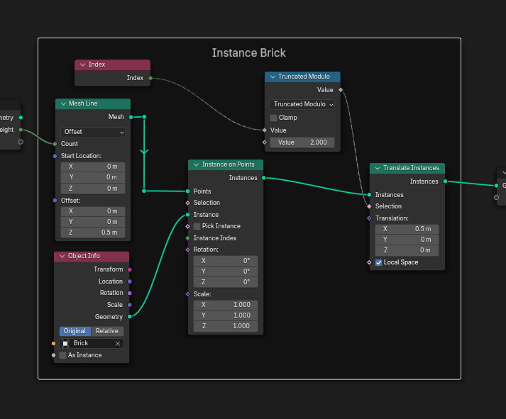 소스 Brick을 그런 위치로 배치하려면, Index값의 홀수에 해당 하는 Index 를 Translate Instances 노드
