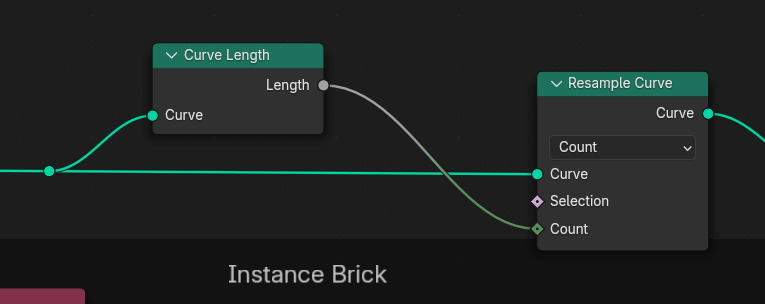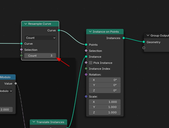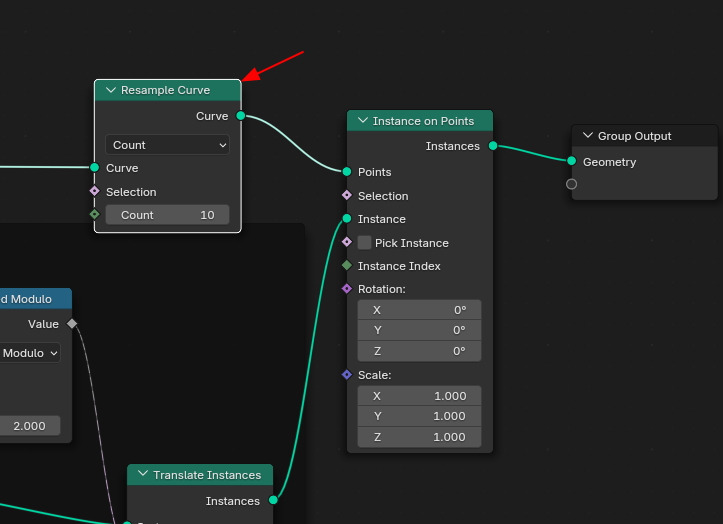 Instance on Points노드 앞에 Resample Curve 노드를 배치하고, 기본값이 Count 10 입니다.